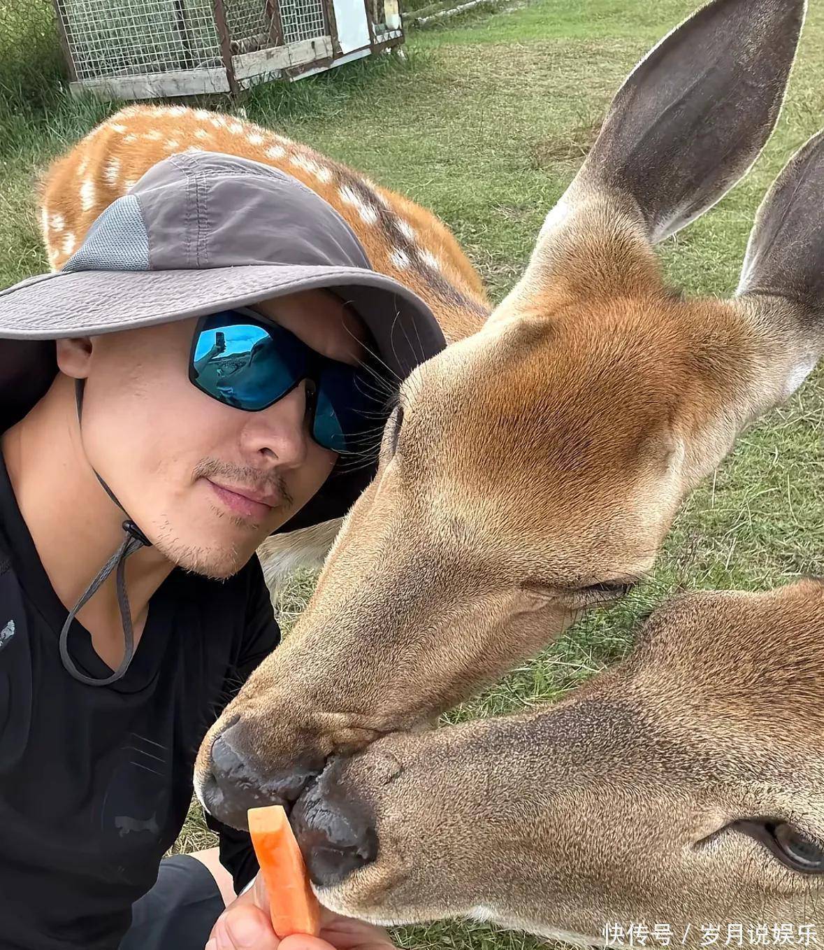 他晒出一张喂食梅花鹿的照片,画面中他蹲在地上,手持胡萝卜条,小心翼翼地递到小鹿嘴边,他头戴遮阳帽,墨镜遮住了大半张脸,但依稀能看出皮肤很白,脸上带着浅浅的笑意,只是细看之下,会发现他胡子没认真打理,显得有些不修边幅,整个人气质沉稳了许多,和多年前荧幕上那个神采飞扬的形象相比,变化不小。